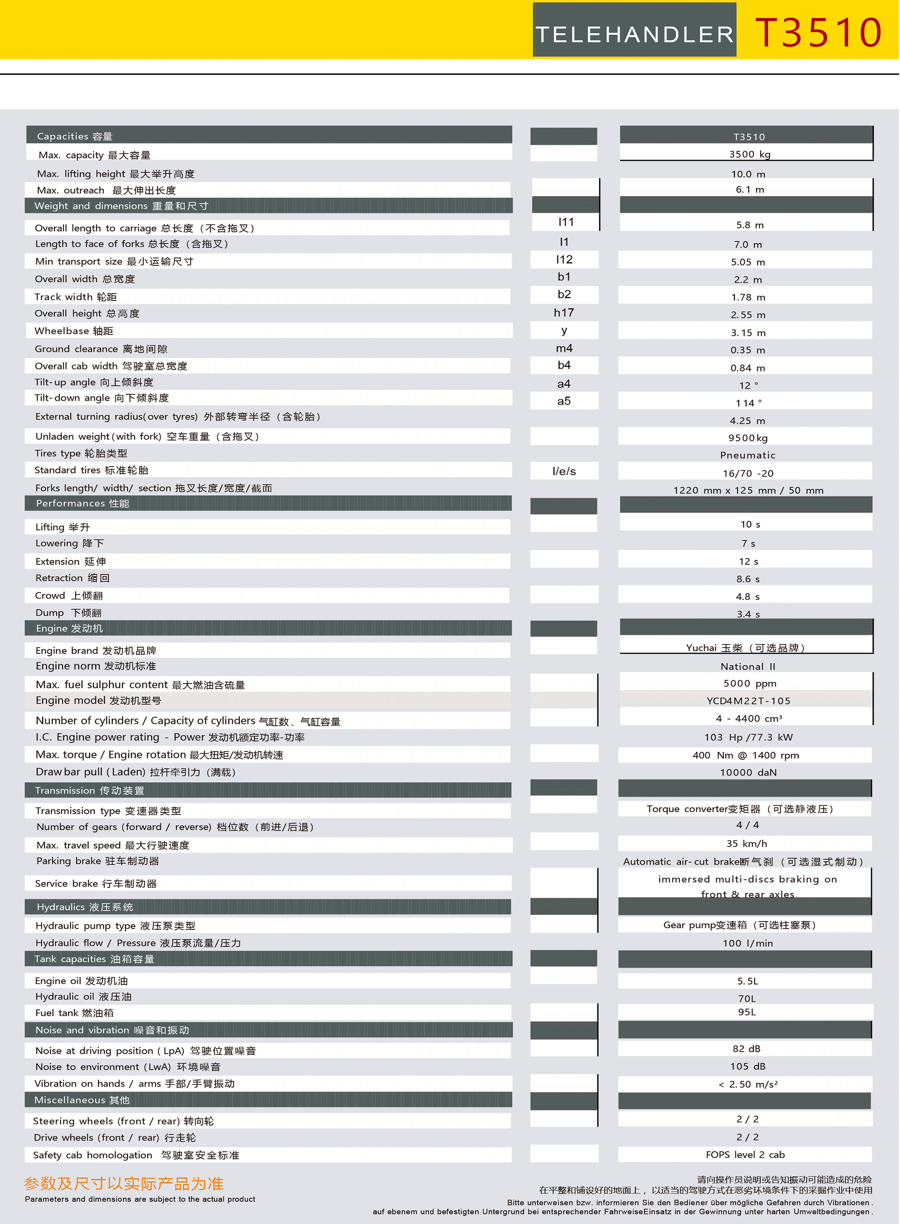 Three-section telescopic arm, Yuchai 77.3KW National II engine, luxury cab with LED lights/window breaker/fire extinguisher/rear sliding window/10-inch driving + reversing image/rear + right front camera, electronic travel, automatic leveling of forks, load-sensitive multi-valve electric proportional control system, 16/70-20 tires, steam brake axle single axle load of 10 tons, special forklift integral high and low speed gearbox (4F/4R), four-wheel drive, front-wheel steering + four-wheel steering + crab walking three steering modes, plate-fin radiator, front and rear adjustable large shell instrument steering wheel, color LCD display, multimedia, torque limiting system, adjustable luxury seat, hydraulic quick change, heating and cooling air conditioning, rubber six hose (with sheath), frame 355 manganese plate, telescopic arm material BS1000 high-strength manganese plate, load capacity 3.5 tons, 1220mm sliding tow fork, lifting 10.5 meters, with outriggers, cast iron counterweight.